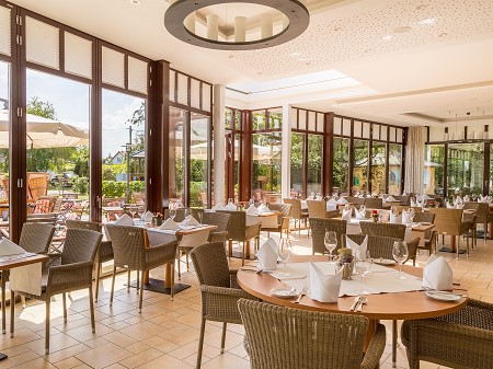 Die Gastronomie besteht aus einem Bankett- und Veranstaltungsbereich mit 4 Räumen mit einer Kapazität bis zu 120 Personen, einem Restaurant mit Wintergarten und Veranda mit 160 Sitzplätzen, einer Hotelbar und einer großzügigen Gartenterrasse. Für die à la carte- und Halbpensionsgäste bietet das Haus eine moderne regionale Küche mit vielen frischen Naturprodukten.